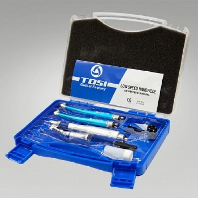 В наборе 2 кнопочных наконечника с керамическими подшипниками, пневмодвигатель, угловой и прямой наконечники.