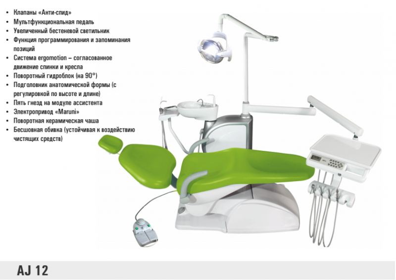 Модуль ассистента с панелью управления и силиконовым ковриком. Поворотный гидроблок с поворотной керамической плевательницей. Большой стоматологический светильник с сенсором. Стул врача с мягкой спинкой и металлическим основанием.