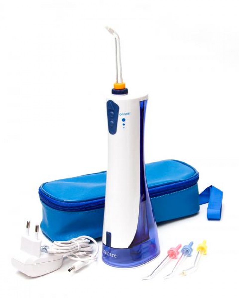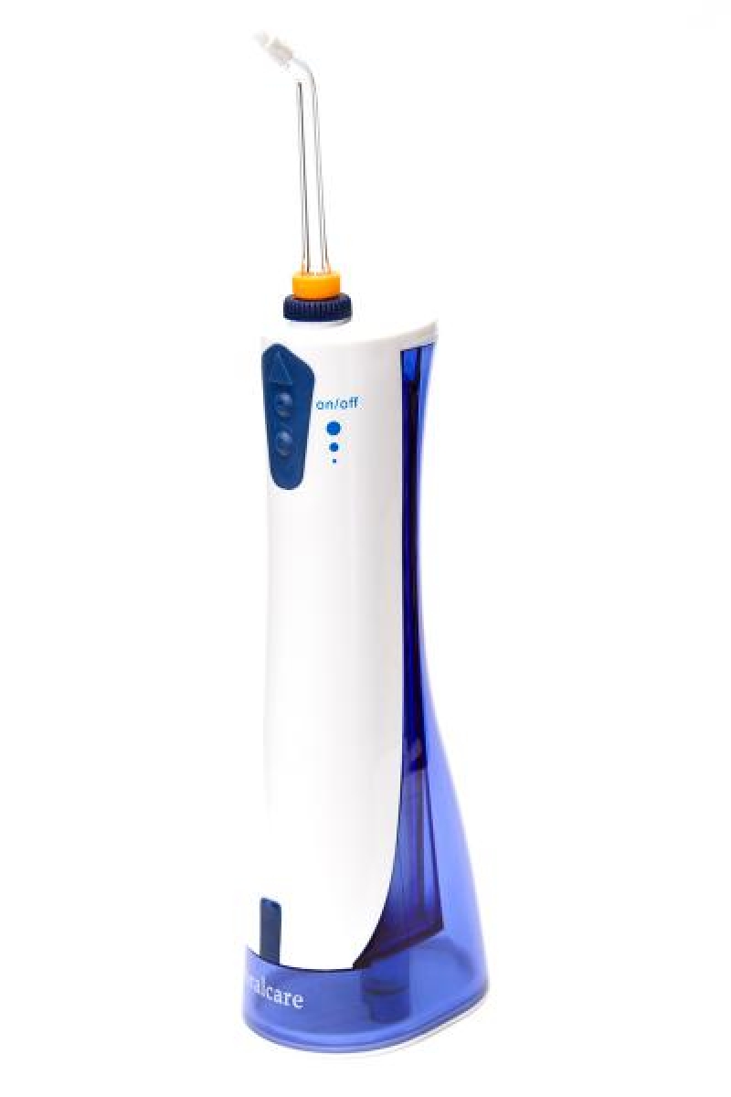 Удобный портативный ирригатор BD2021B. Работает от аккумулятора, который предварительно заряжается от сети.